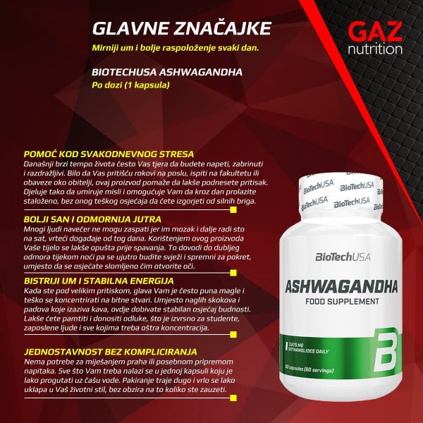 Rješenje koje priroda nudi zove se BioTechUSA Ashwagandha. To je dodatak prehrani u kapsulama koji sadrži ekstrakt korijena biljke poznate tisućama godina. U jednoj kapsuli nalazi se točno 245 mg ekstrakta korijena ashwagandhe. Ova biljka pomaže tijelu da se lakše nosi s naporima modernog života.