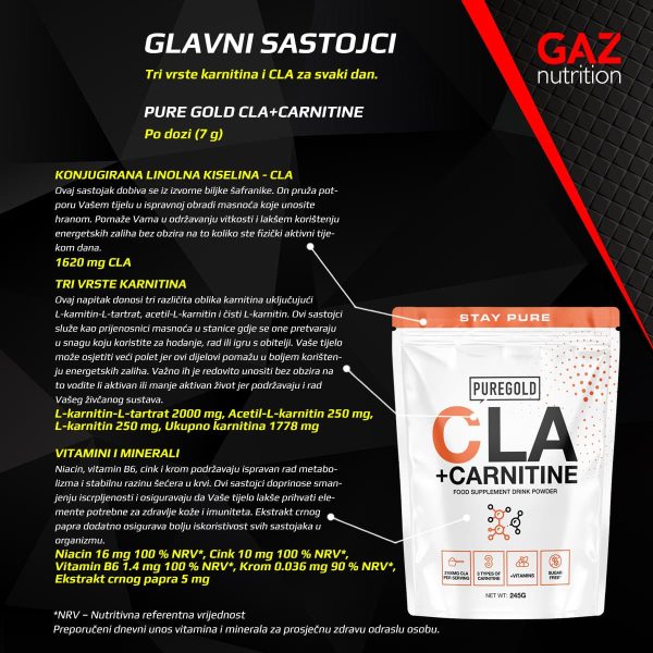 Pure Gold CLA+Carnitine je dodatak prehrani u obliku praha koji se miješa s vodom i ne sadrži šećer. U sastavu proizvoda se nalaze CLA masne kiseline i tri oblika karnitina koji sudjeluju u metabolizmu masti i stvaranju energije. Proizvod je obogaćen vitaminima i mineralima koji doprinose smanjenju umora, normalnom radu organizma i zaštiti stanica od oksidativnog stresa. Namijenjen je osobama koje žele podršku metabolizmu i svakodnevnoj aktivnosti uz lagan i osvježavajući napitak s niskim udjelom kalorija. Jedno pakiranje od 245 g dovoljno je za 35 dana korištenja.
