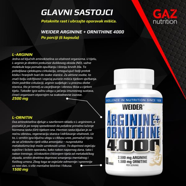 Weider Arginine + Ornithine 4000 je dodatak prehrani u obliku kapsula koji sadrži dvije važne aminokiseline poznate po svojoj sposobnosti da podupiru sportske performanse i oporavak. Evo što ga čini tako učinkovitim: