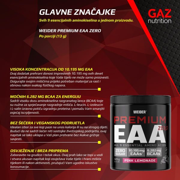 Weider Premium EAA Zero je dodatak prehrani u obliku praha koji se miješa s vodom i čini osvježavajući napitak pun aminokiselina. Glavne značajke ovog proizvoda su: