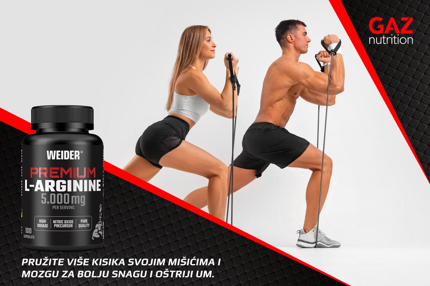 Bočica Weider L-Arginine Caps dodatka prehrani pored fit muškarca i žene koji vježbaju s elastičnim trakama, simbolizirajući snagu i oporavak mišića.