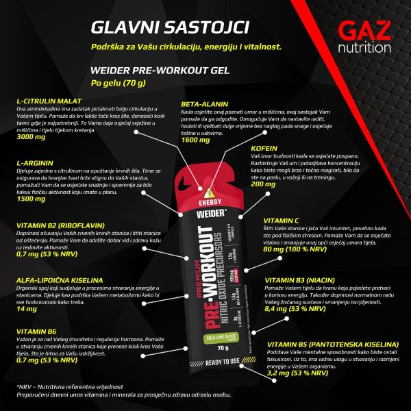Weider Pre-Workout Gel je energetski dodatak prehrani u obliku gela, stvoren da Vam omogući bolju prokrvljenost mišića, energiju i izdržljivost. Sadrži aminokiseline citrulin i arginin koji kao prekursori dušikovog oksida, potiču cirkulaciju i širenje krvnih žila. Za manji umor i podizanje razine energije tu su beta-alanin, kofein i vitamini. Ovaj izuzetan energetski gel je spreman za izravnu konzumaciju s osvježavajućim okusom limun – kola.